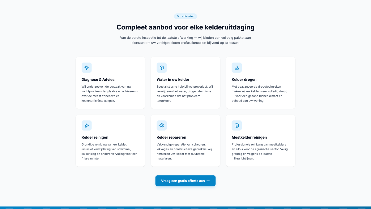 Voor De Kelderspecialist Gorredijk ontwikkelden we een professionele WordPress website die het familiebedrijf online zichtbaar maakt. De site presenteert hun diensten op het gebied van vochtbestrijding en maakt het voor klanten eenvoudig om contact op te nemen of een offerte aan te vragen.